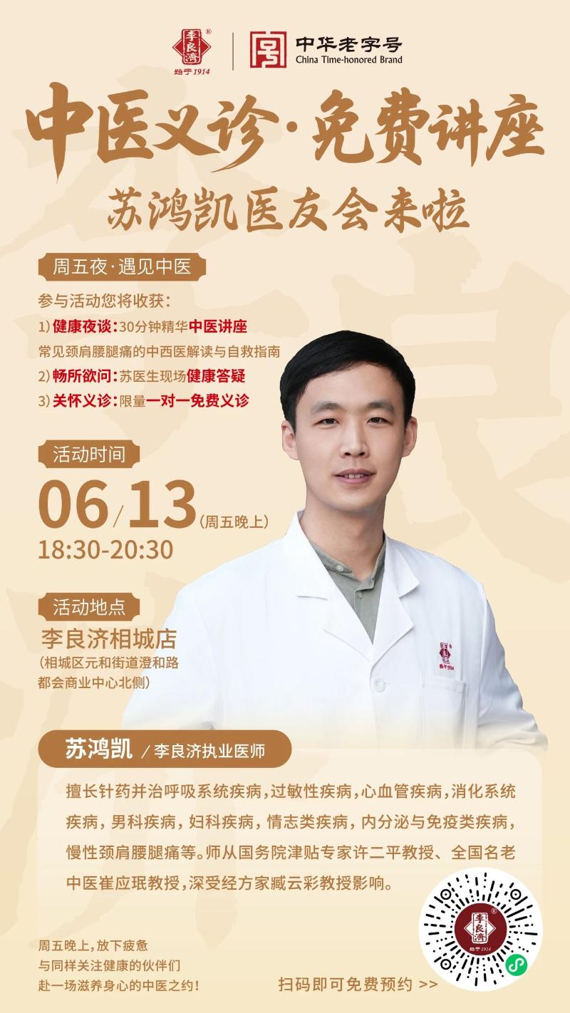 本周五晚上,蘇鴻凱醫(yī)生將在李良濟(jì)相城店開啟專場(chǎng)醫(yī)友會(huì),面對(duì)面與大家溝通交流,幫助你解決常見疼痛和健康問題!